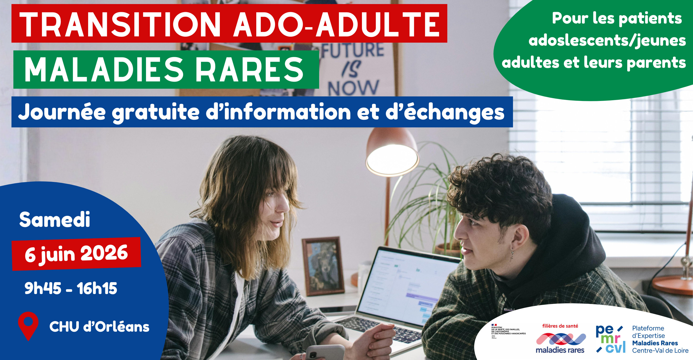 Samedi 6 juin 2026 se tiendra la journée transition ado-adultes maladies rares à Orléans. Cette journée est à destination des patients adolescents/jeunes adultes porteurs de maladies rares et leurs parents/accompagnants.